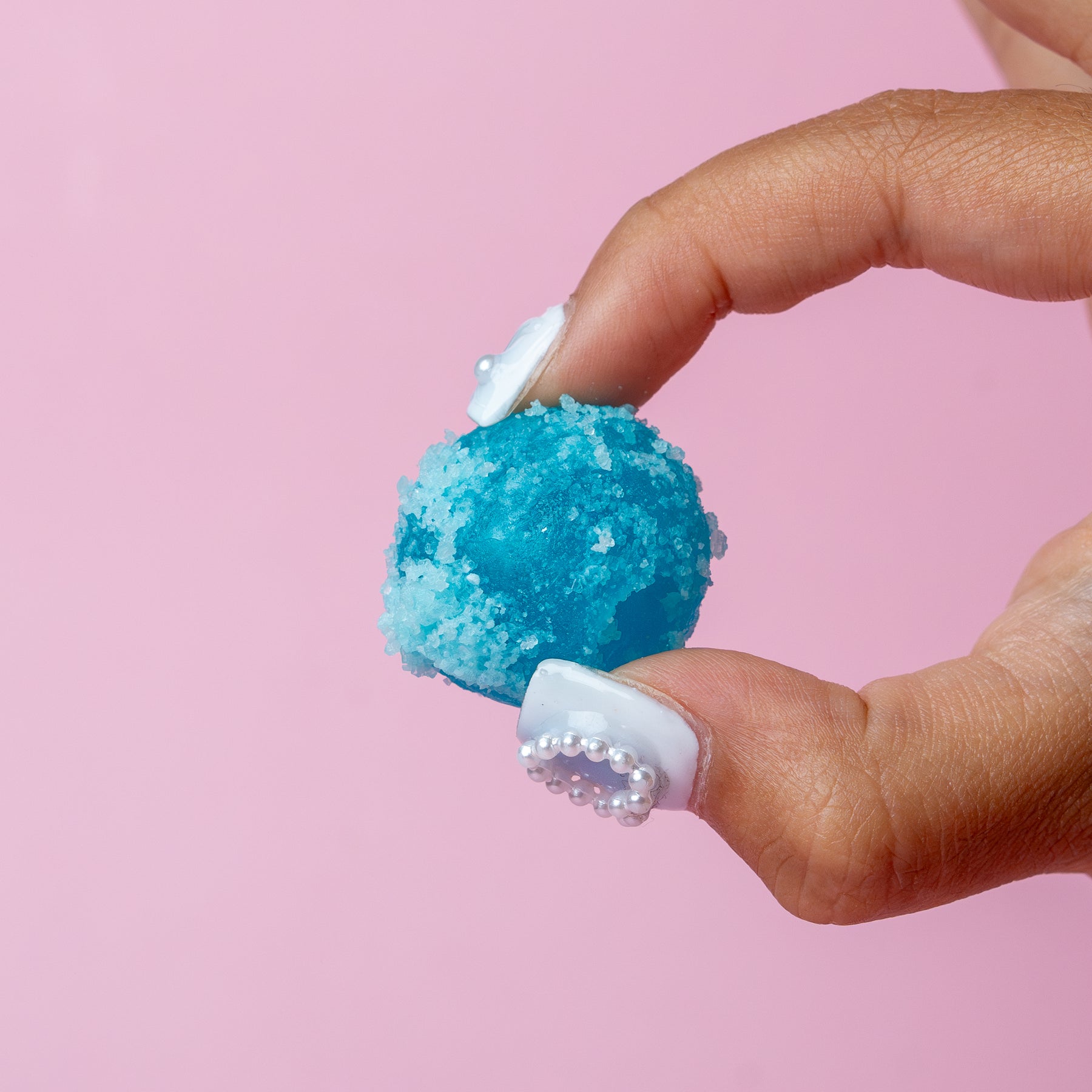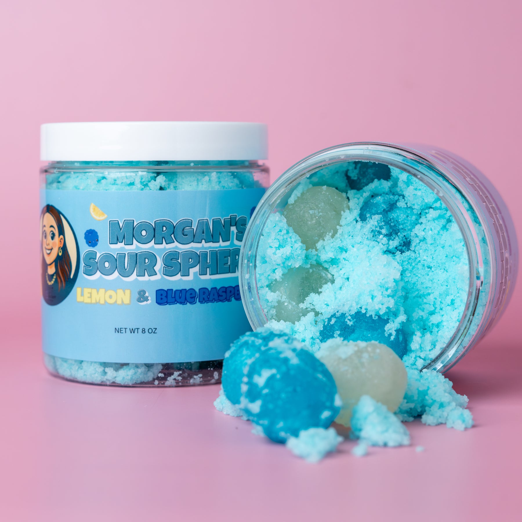 Get ready for a mouth-watering, mouth-puckering sour experience like no other. Morgan’s Sour Spheres combine bright lemon and bold blue raspberry flavors in stunning handcrafted crystal candy form. Each shimmering sphere has a crunchy exterior, a firm jelly-like center, and is coated in Blue Raspberry Sizzle Glitter for an extra sour spark that hits instantly.