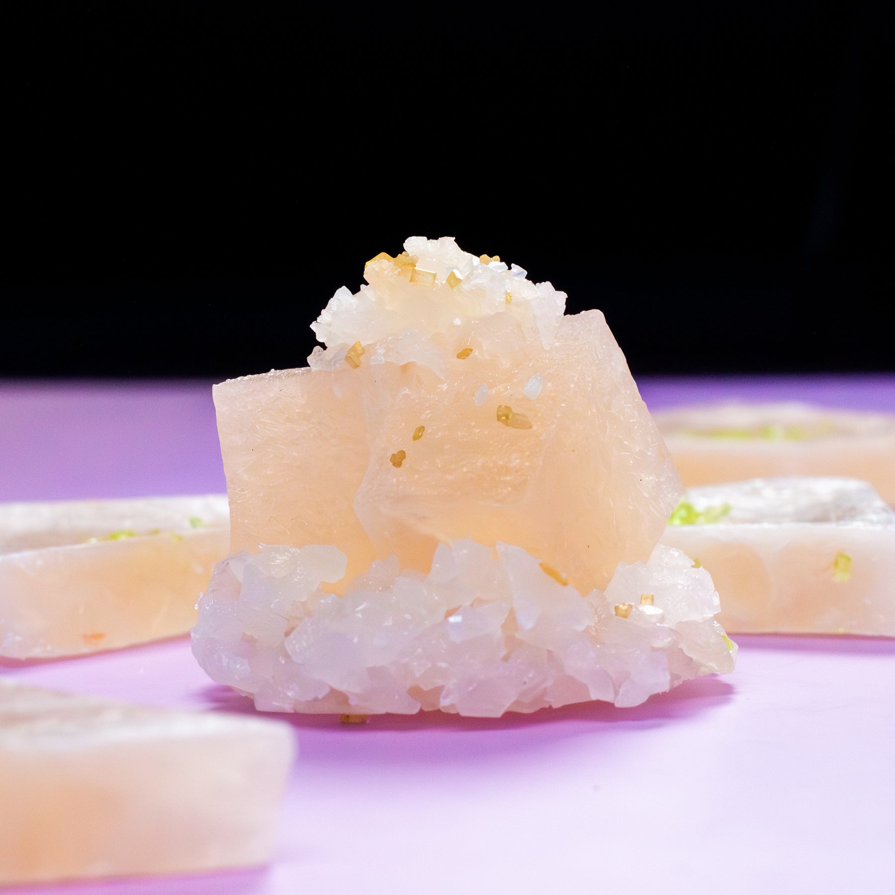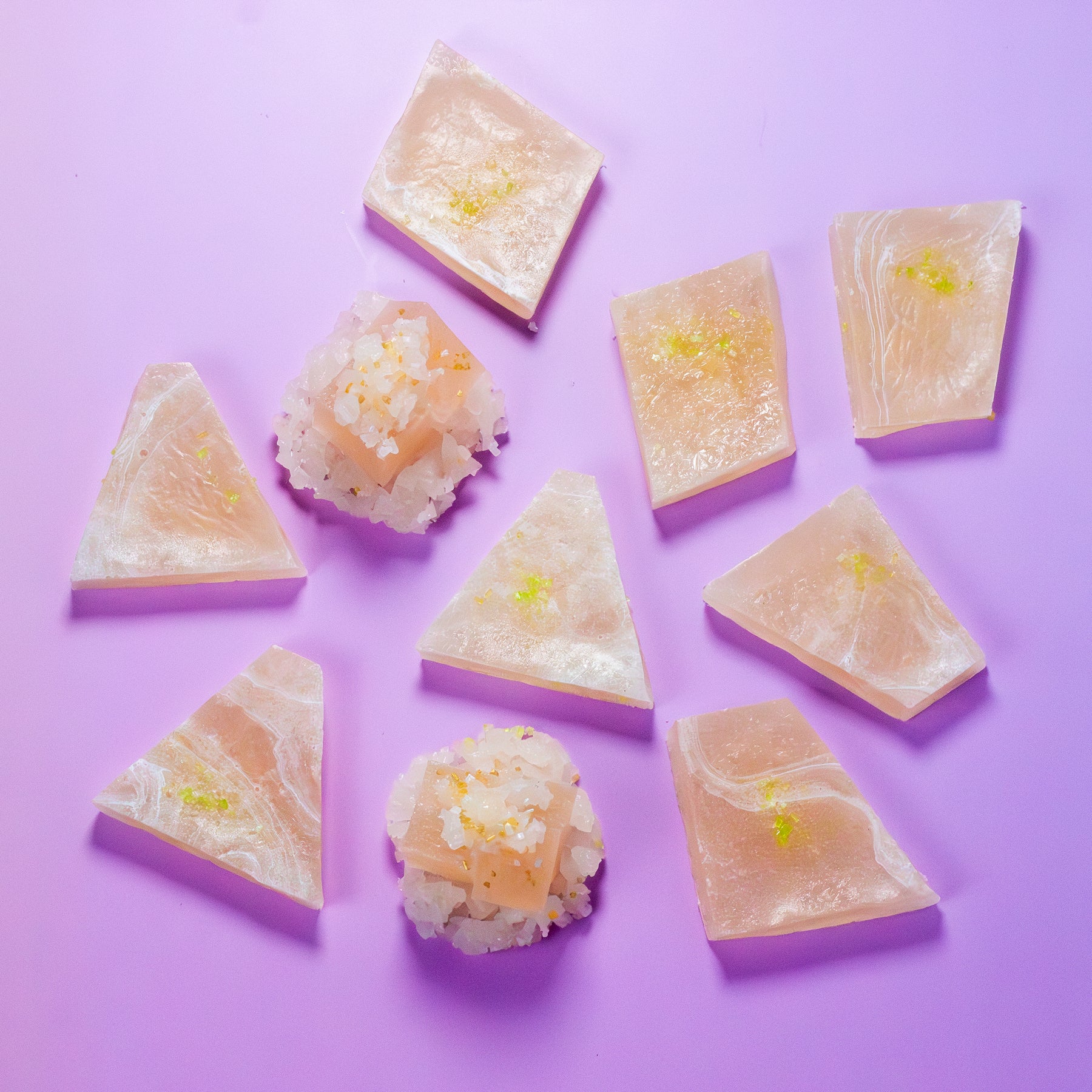 Thành phần: Đường, thạch rêu biển, matcha, dâm bụt, dâu tây, đào, yuzu, anh đào, đậu bướm, xoài, dừa, vải thiều, hoa oải hương, nho, hoa hồng, lê, táo, bạc hà, chanh, tím, lá dứa, dâu đen , việt quất, mâm xôi, sô cô la trắng, gừng, dứa, dưa hấu, táo xanh, táo. quế, nho đen, sô cô la đen, thanh long, nho, chanh dây, vani, nam việt quất, chanh, cam huyết, dầu bơ, vàng cấp thực phẩm, long lanh cấp thực phẩm.